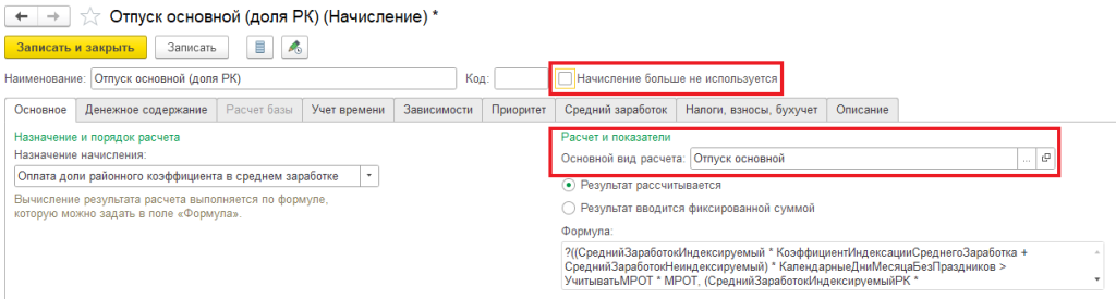 3. Верните их из архива. Для этого в карточках найденных начислений снимите флаг «Начисление больше не используется». В начислениях долей РК и СН обязательно проверить, чтобы было заполнено поле «Основной вид расчета».