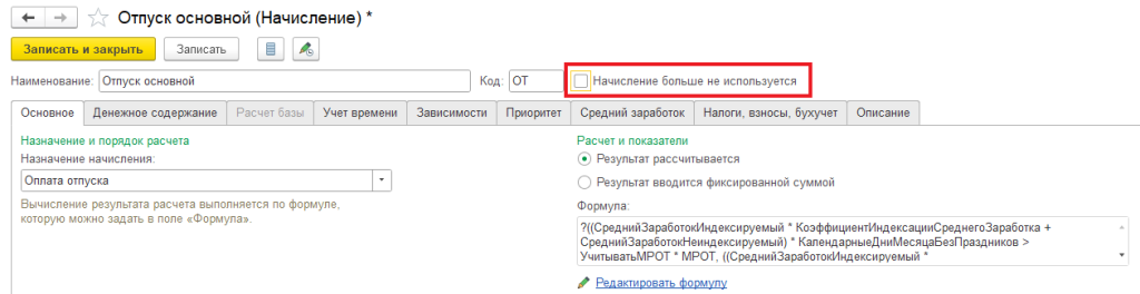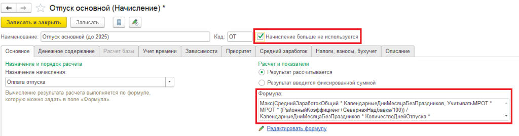 1. Отключите типы начислений, которые использовались в 2025 году, и в формуле которых отсутствуют показатели, относящиеся к долям РК и СН. Откройте карточку такого начисления (без выделения долей) и установите флаг «Начисление больше не используется».