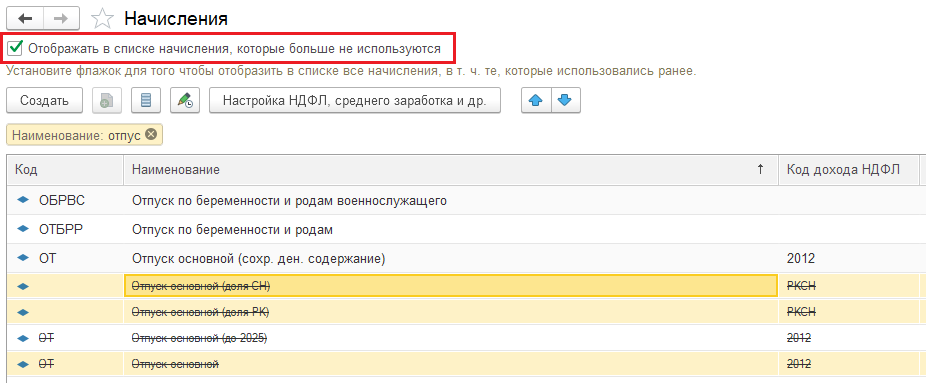 2. Найдите прежние типы начислений, которые использовались ранее. Для этого установите флаг «Отображать в списке начисления, которые больше не используются». Так вы сможете увидеть в списке начисления с выделением долей РК и СН, которые ранее были перемещены в архив (их наименование будет зачёркнуто).